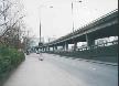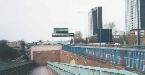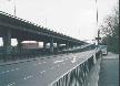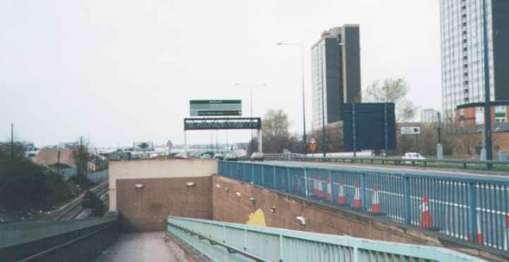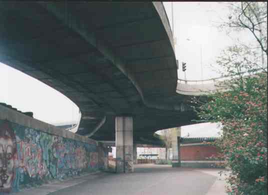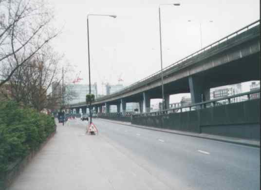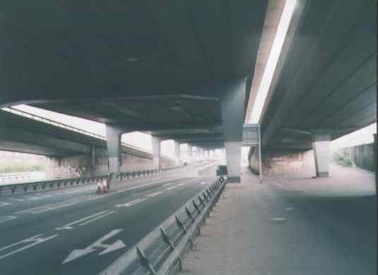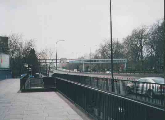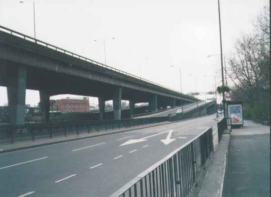 [looking eastbound at the same place] ...if only they'd let exiting traffic (on the slip road in the centre of the picture) join the Harrow Road, (the lower road to the left of the picture), here. Instead, there is a sharp bend (massive chevrons just visible in the centre of the picture) to the right, and the off-slip crosses the railway line and chucks you into Paddington. I think it's either bloody-mindedness on the part of the road's designers, or that the link would not be needed due to other motorway construction (e.g. the North Cross Route) which never happened. |