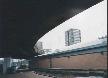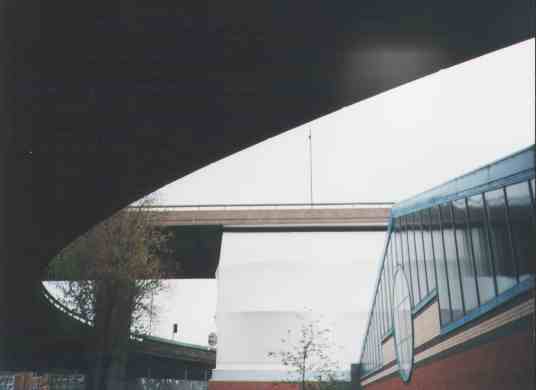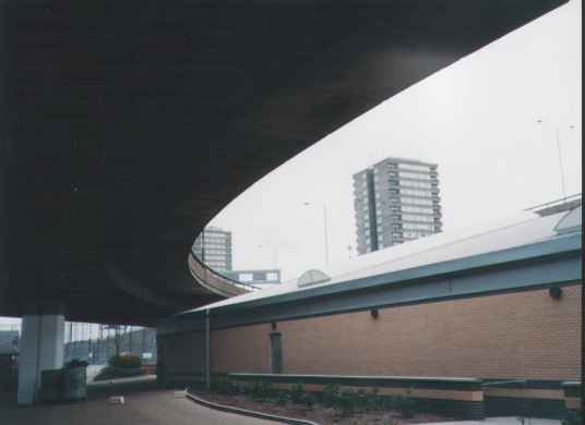 A view of the junction (looking south-east) from underneath -- the high flyover is the A40 Westway. The elevated road dominating the picture is the roundabout that forms the junction. You can just make out the old-style motorway signals -- two orange lights mounted on gantries -- near the middle of the picture. The building in the middle of the roundabout is a relatively recent sports centre. |