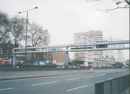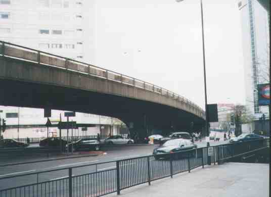 Looking east towards the Marylebone flyover: the eastern end of the Westway bridges the A5 Edgware Road and becomes the A501. There's a plaque on the flyover commemorating its construction and opening -- this is just visible on the centre right of the picture, slightly to the left of the lamppost. |
