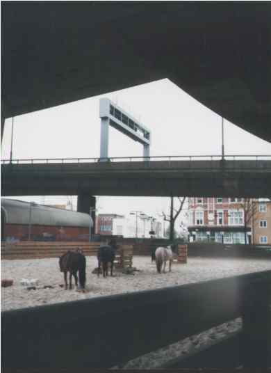 This picture was taken from Royal Oak station, looking eastbound. This is the equivalent junction to the last picture: it is an on-slip to the westbound carriageway (the elevated road at the right of the picture), rather an off-slip from the eastbound carriageway. The A40 (both carriageways) is the wide elevated road that dominates the picture. The westbound carriageway of the A404 Harrow Road runs directly beneath the A40 at this point; you can see it emerging from a short underpass near the centre of the picture. There is also access to the Harrow Road at this point; this is the road which merges with the Harrow Road where the cones are in the foreground. The elevated road to the left of the picture is the eastbound off-slip, as seen in the previous two photos, and the eastbound carriageway of the Harrow Road is hidden behind this. What a cool road layout (it's impossible to decipher various maps' interpretations of the roads here)! |