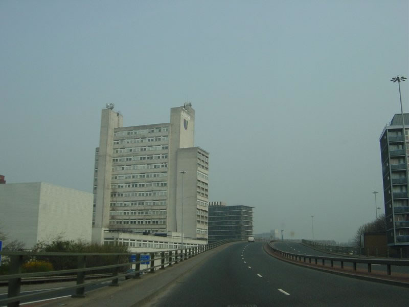 The flyover over the A6, and the A635(M) itself was only added in the early 1990s. The UMIST campus and its landmark Maths & Social Sciences building is on the left.