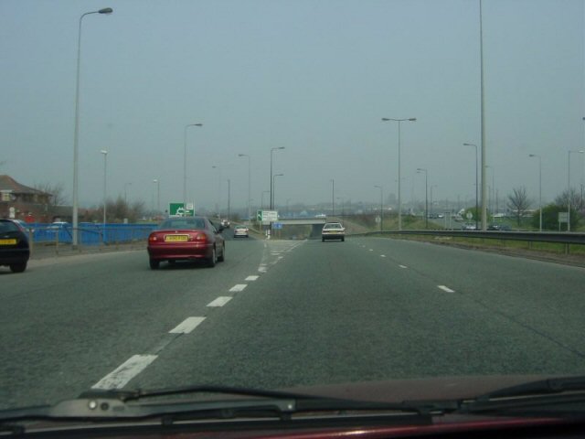 Joining the motorway at the Oldham end. This is actually the A663 coming out of Manchester that becomes the A627(M). The beginning of motorway restrictions signpost can be seen in the distance.