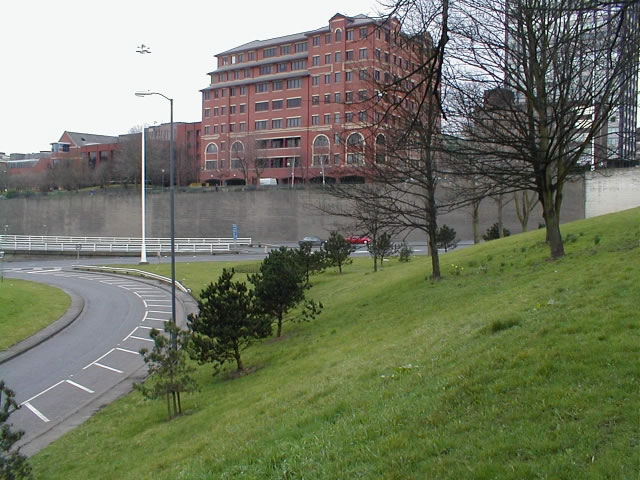 The other end of the North Street loop - no fences, walls, or anything to divide the motorway (no pedestrians) from the park (picnics on the grass). Until the loop merges in the motorway mainline is the A58(M).