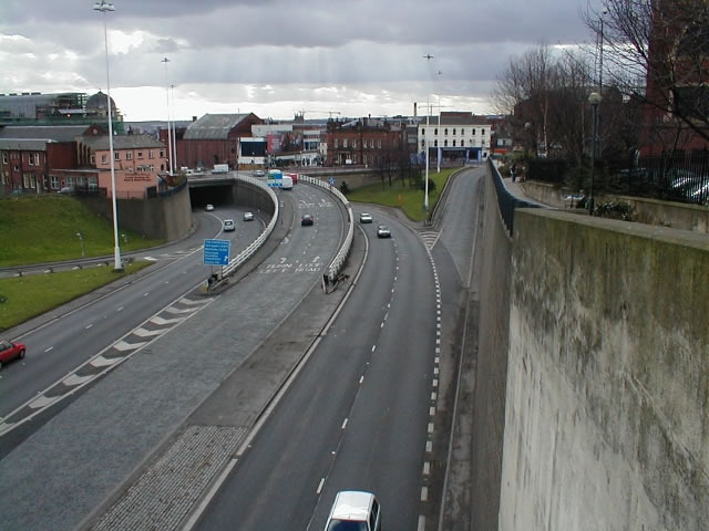 A wider shot of the North Street junction with right-hand exit carrying the rest of the A58(M). The sliproad joining on the right has an A58(M) start-of-restrictions sign, unusually written in Motorway.