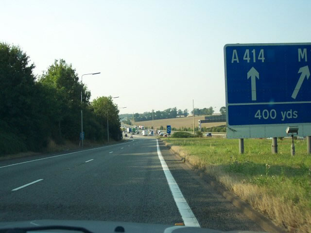 It appears to suggest that the left hand lane is for the A414, the right for the M1.