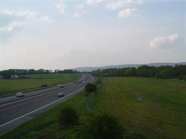 But if we look westwards towards the M898, there's no evidence of the loop that once existed here, except for possibly a bridge over a small stream that can just about be seen between the two small trees next to the motorway.