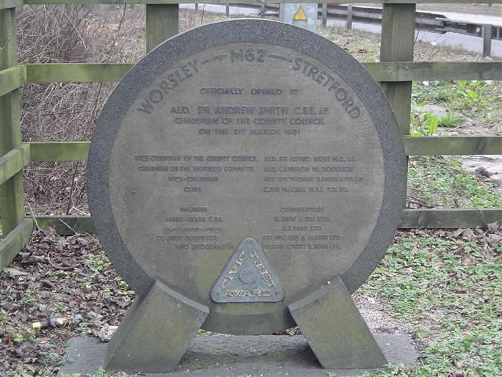 The commemorative stone marking the opening of the M62 Stretford - Eccles Bypass. It's at the southbound entry at M60 J13. |