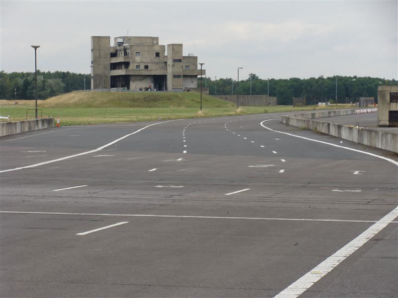 In order to allow for high speed testing, the M96 has an "acceleration area", which isn't part of the motorway itself. You can see one of the fire practice concrete buildings in the backgroung.